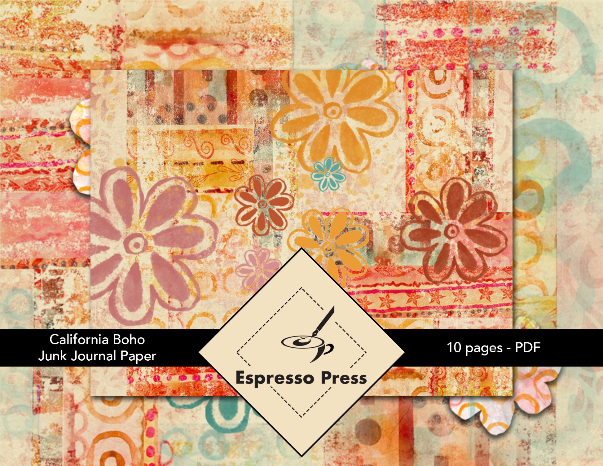 California Boho Junk Journal Paper. Watercolor, mixed media collage and handcrafted foam stamp images designer papers in boho style. 10 pages for journals, keepsake books, paper crafts, cards and more. Landscape format. Press quality 300 DPI. 1 PDF. About 18MB.