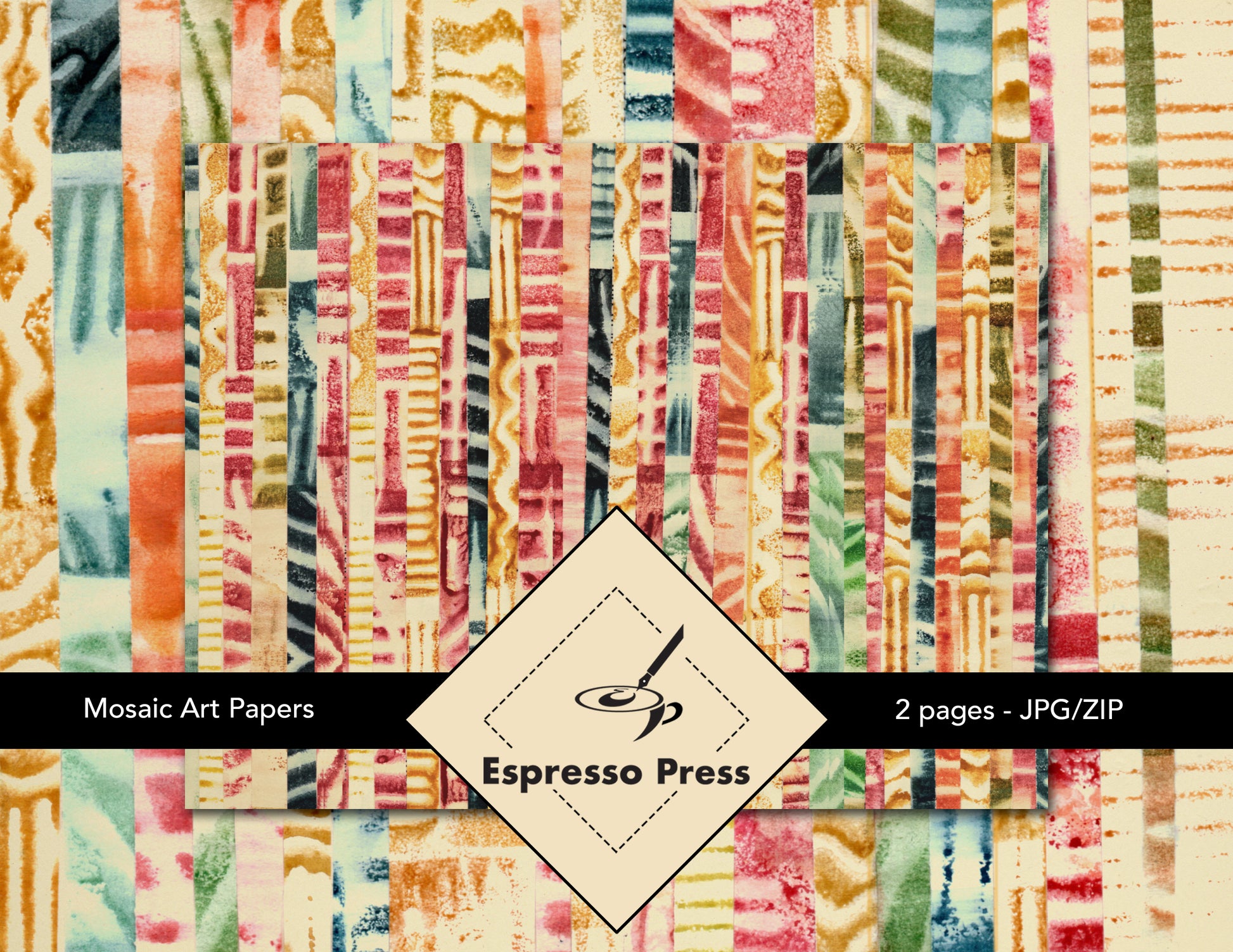 Handmade art paper collection, my own collage designs created from handmade custom stamps. 2 digital pages for journals, keepsake books, paper crafts, cards and more. 8.5"x11". Landscape format. Press quality 300 DPI. JPG/ZIP About 13MB.
